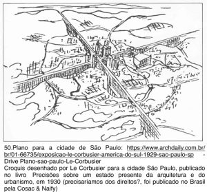 Le Corbusier deixou alguns marcos de sua passagem por São Paulo. Desenhou em croquis um projeto urbanístico para a cidade: “Para vencer as sinuosidades do planalto de São Paulo, repleto de colinas, podem-se construir autoestradas em nível, sustentadas por arranha-terras.